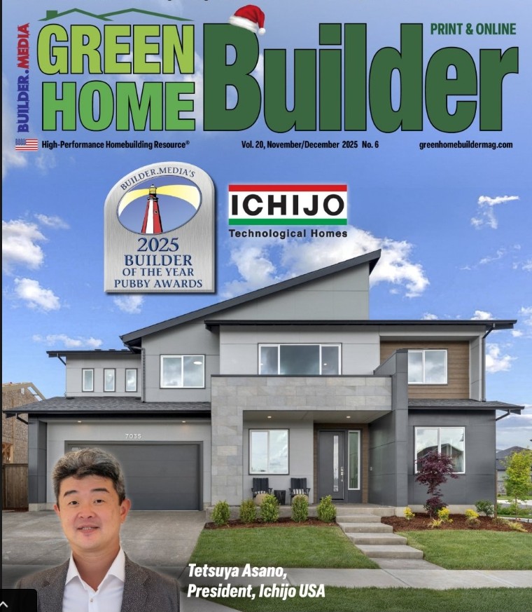 Ichijo USA has been Awarded Green Home Builder of the Year 2025 by Builder’s Media and is featured in the December issue of the Green Home Builder Magazine. In this issue, the President of Ichijo USA, Tetsuya Asano, describes the philosophy and goals of the company. “Our experience with technology and focus on craftsmanship creates sustainable homes that are energy efficient and artfully constructed. One at a time, It’s not just the next thing, it’s the right thing.”