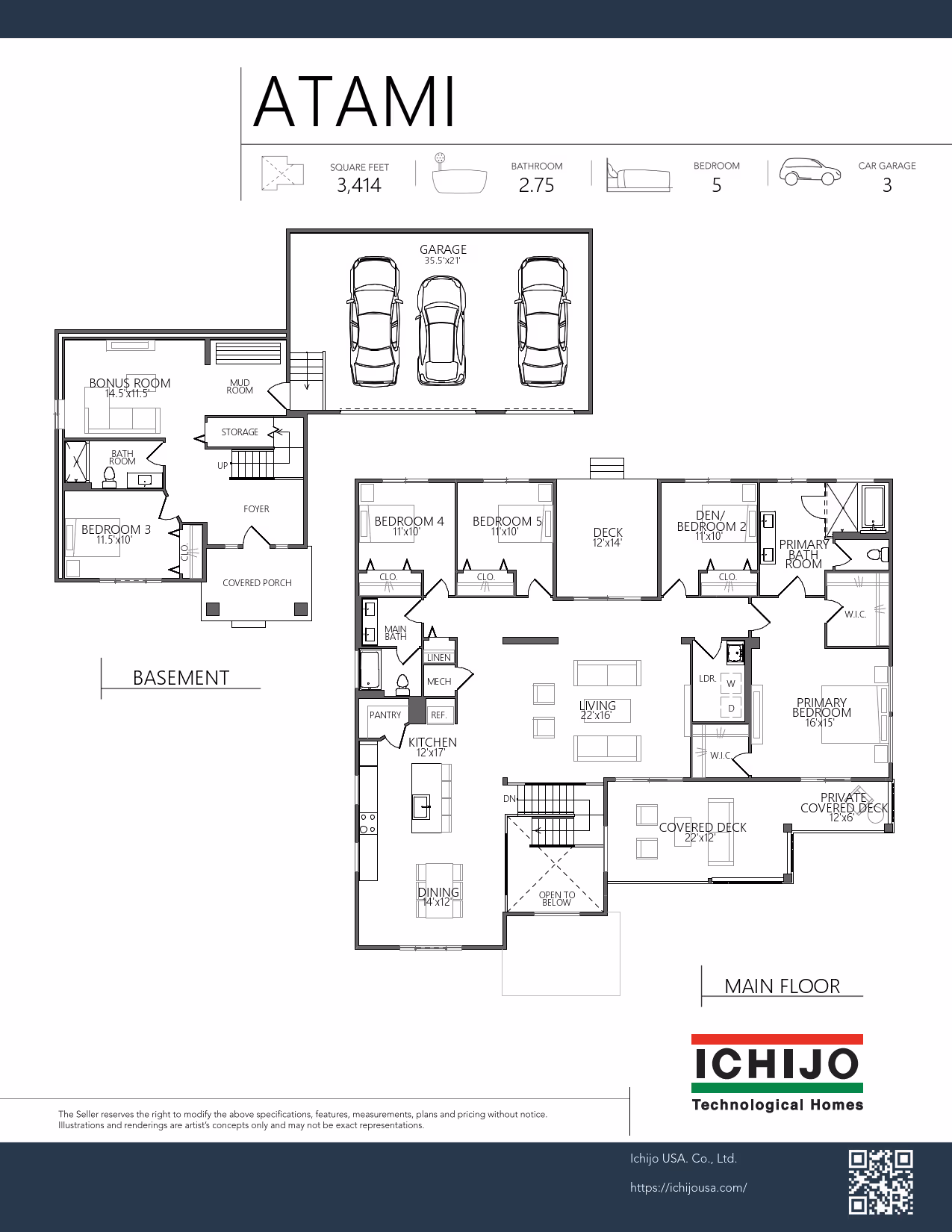The Atami is a spacious plan with five bedrooms, including a large primary suite with two walk-in closets, a spa bathroom and access to the large, covered deck. The kitchen is a chef’s dream with a large four stool island, spacious pantry and a dining room adjacent but away from the living room for a bit more privacy. The additional bedrooms and den are adjacent to another covered deck with access to the backyard. Need some additional mother-in-law or guest space, the Atami has a guest suite on the first floor that includes a large bedroom, bathroom and bonus family room. There’s also easy access to the mud room and oversized three car garage. There’s room for everyone here!